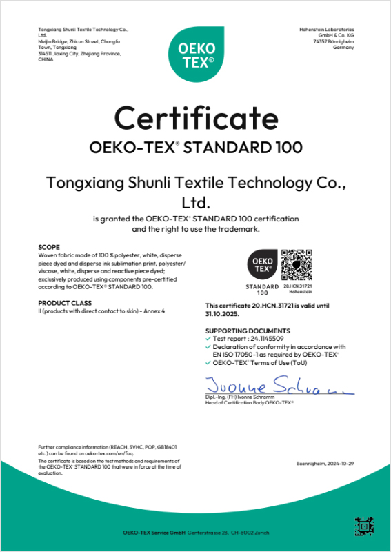 Her şeyden önce, polyester iç astar kumaşlarının dayanıklılığı önemli avantajlarından biridir. Polyester elyaf, son derece yüksek aşınma direncine ve yırtılma direncine sahip sentetik bir liftir, günlük aşınma sırasında sürtünme ve gerginliğe dayanabilir ve giysilerin servis ömrünü uzatabilir. Genellikle sık aşınma ve kullanımla karşı karşıya olan giysiler için, polyester astar, uzun süreli kullanım sırasında giysinin stabilitesini sağlamak için güçlü bir destek sağlar. Tongxiang Shunli Textil Technology Co., Ltd.'nin polyester astar bez kumaşları, özellikle kıyafet ve ceketlerin astar kısımlarında üst düzey giyim üretiminde yaygın olarak kullanılmaktadır.